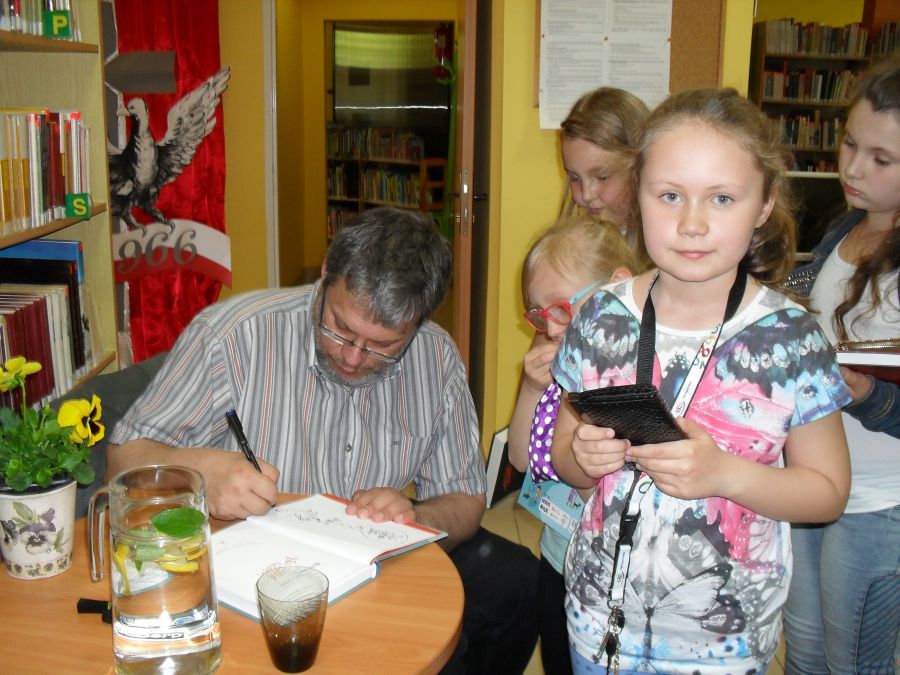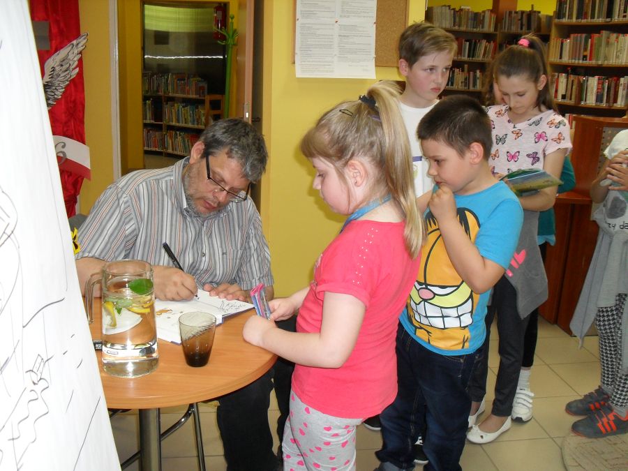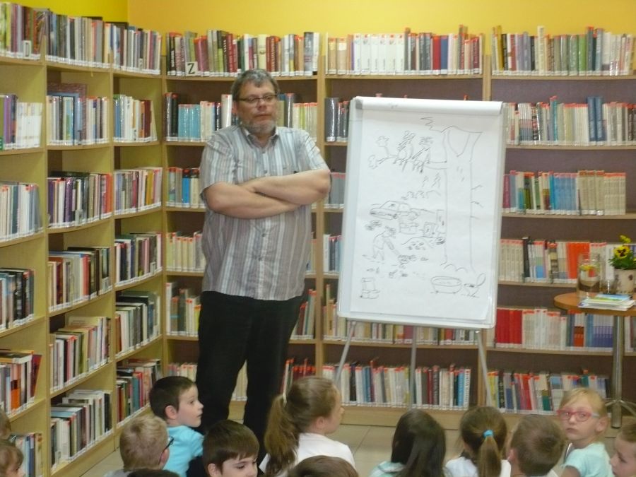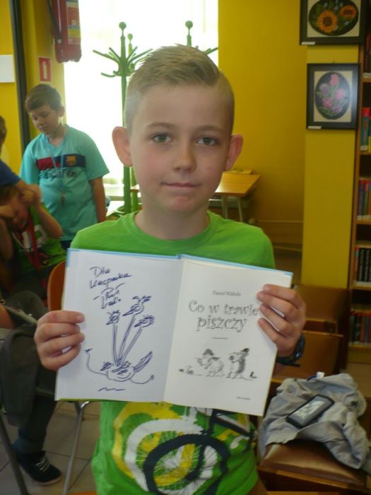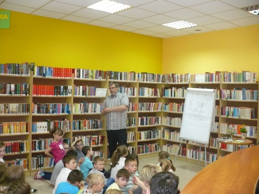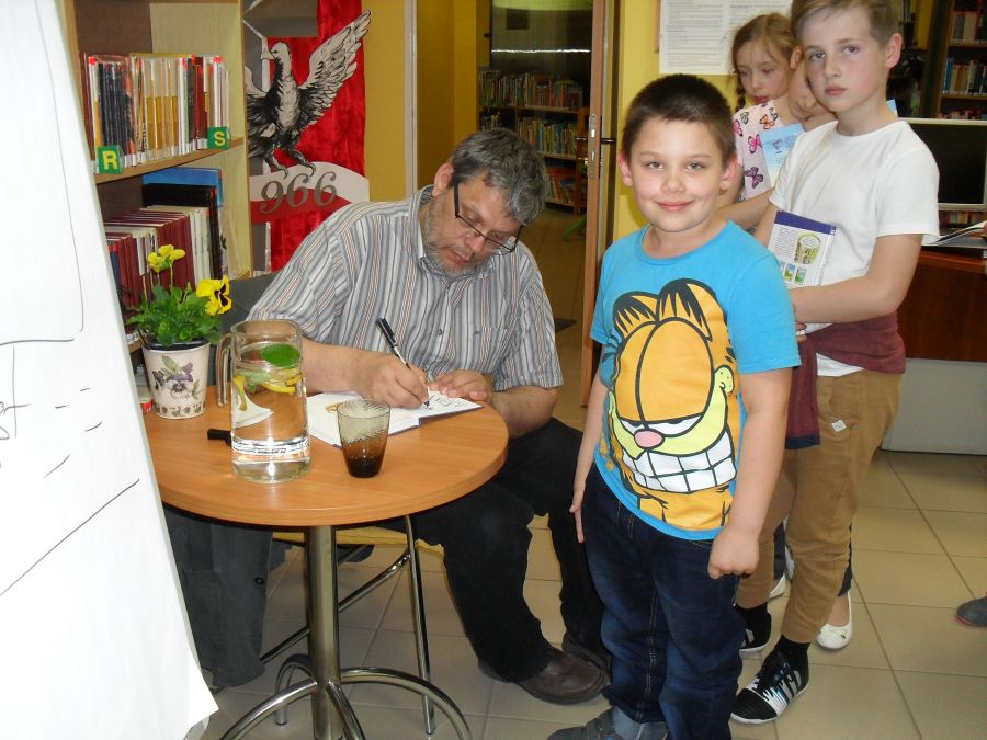 12 maja 2016r. w Filii nr 1 Miejskiej Biblioteki Publicznej w Kraśniku odbyło się spotkanie autorskie z p. Pawłem Wakułą. Uczestniczyły w nim dzieci z klasy I d, klasy II c i klasy III a – integracyjnej. Paweł Wakuła to pisarz i rysownik - humorysta. Od lat związany jest z tygodnikiem „Angora” oraz popularnym dodatkiem dla dzieci - „Angorka”. Opowiadania ze zbioru - „Co w trawie piszczy” zostały w 2007 roku wyróżnione w konkursie literackim im Astrid Lindgren organizowanym przez fundację ABCXXI - Cała Polska czyta dzieciom. Jest autorem książek: „O czym szumi las”, „Na tropie sześcioptaka”, „Dębowa kołyska”, „Jagiełło pod prysznicem” oraz komiksów: „Dwa końce świata”, „Opętani”. Ponadto jego utwory można znaleźć w antologiach: „Opowiadania z kluczem”, „Opowiadania o psach. Na psa urok!”, a także licznych audiobookach, których możemy wysłuchać na antenie polskiego radia. W czasie tego spotkania dzieci dowiedziały się o pracy pisarza – rysownika, poszerzyły swoją wiedzę na temat zachowań proekologicznych, a przede wszystkim zachęciły do czytania książek.
