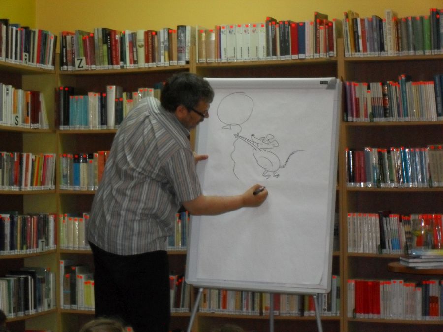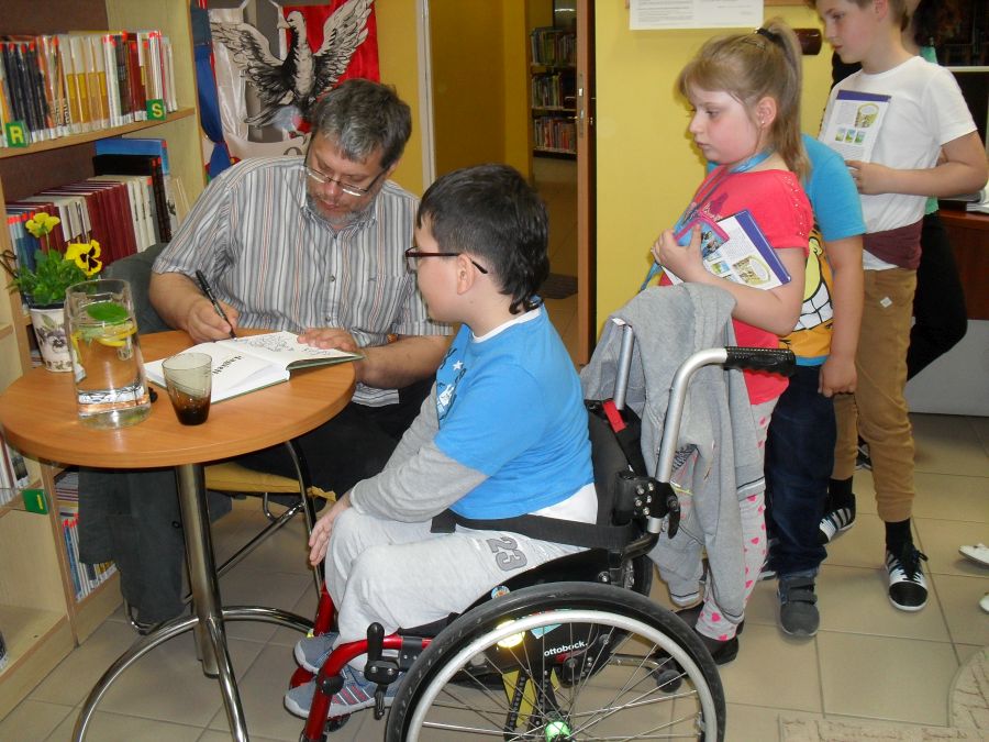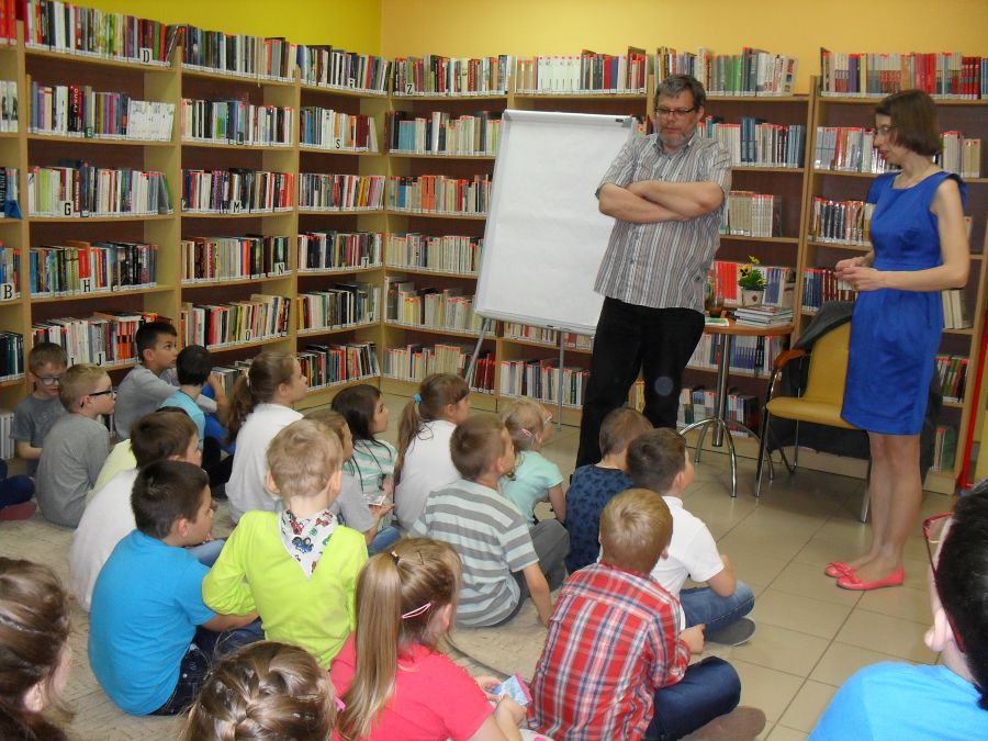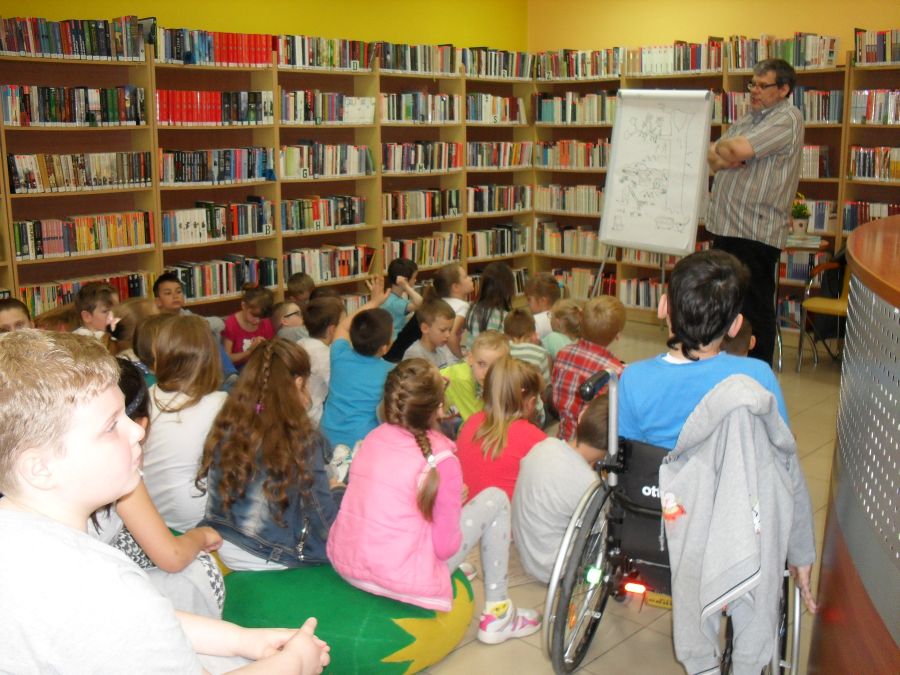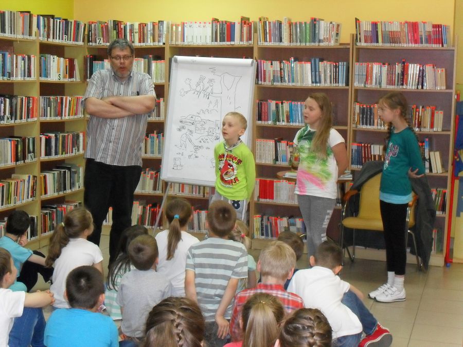 12 maja 2016r. w Filii nr 1 Miejskiej Biblioteki Publicznej w Kraśniku odbyło się spotkanie autorskie z p. Pawłem Wakułą. Uczestniczyły w nim dzieci z klasy I d, klasy II c i klasy III a – integracyjnej. Paweł Wakuła to pisarz i rysownik - humorysta. Od lat związany jest z tygodnikiem „Angora” oraz popularnym dodatkiem dla dzieci - „Angorka”. Opowiadania ze zbioru - „Co w trawie piszczy” zostały w 2007 roku wyróżnione w konkursie literackim im Astrid Lindgren organizowanym przez fundację ABCXXI - Cała Polska czyta dzieciom. Jest autorem książek: „O czym szumi las”, „Na tropie sześcioptaka”, „Dębowa kołyska”, „Jagiełło pod prysznicem” oraz komiksów: „Dwa końce świata”, „Opętani”. Ponadto jego utwory można znaleźć w antologiach: „Opowiadania z kluczem”, „Opowiadania o psach. Na psa urok!”, a także licznych audiobookach, których możemy wysłuchać na antenie polskiego radia. W czasie tego spotkania dzieci dowiedziały się o pracy pisarza – rysownika, poszerzyły swoją wiedzę na temat zachowań proekologicznych, a przede wszystkim zachęciły do czytania książek.