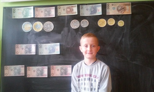 Na kolejnych zajęciach z przedsiębiorczości uczniowie zapoznali się z wizerunkiem polskich monet i banknotów. Omawiali ich kształt, wygląd oraz odszukiwali na banknotach zabezpieczenia, np. znak wodny, metalizowaną nitkę zabezpieczającą. Dzięki Otylii i Wojtkowi mogli obejrzeć monety i banknoty polskie, które już wyszły z obiegu. Podczas zabaw z wykorzystaniem kasy utrwalali nominały monet i banknotów.