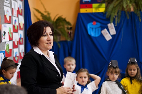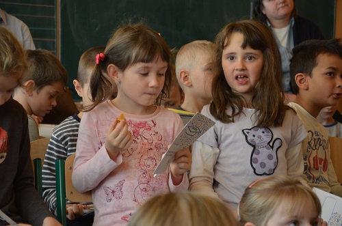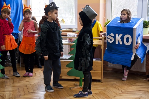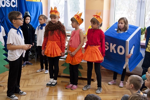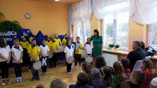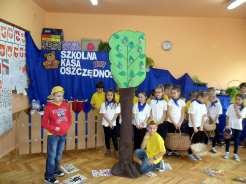- 3 XI 2015 r. uczniowie klasy V d i II d przygotowali dla kolegów klas pierwszych inscenizację "Ziarnko do ziarnka". W piosenkach i krótkich scenkach przedstawili co i jak można oszczędzać. Na spotkaniu gościliśmy przedstawiciela Banku PKO BP panią Marzenę Szymańską, która zapoznała uczniów klas I z internetowymi kontami SKO. Otrzymali oni również drobne upominki i słodycze sponsorowane przez Bank PKO BP.