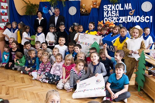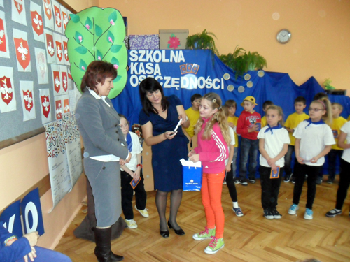 - 28 listopada klasa II b przedstawiła inscenizację dla klas pierwszych "Grosz do grosza, czyli uczymy się oszczędzać". Na spotkaniu gościliśmy panią Marzenę Szymańską - przedstawiciela Banku PKO BP S.A. Starsi uczniowie poprzez swoje wypowiedzi, scenki dramowe, piosenki przekazali wiedzę na temat oszczędzania pierwszakom. Otrzymali oni również swoje pierwsze książeczki SKO. Pani Marzena Szymańska wręczyła upominki ufundowane przez PKO BP S.A uczniom najlepiej oszczędzającym w roku szkolnym 2011/12.A oto oni: